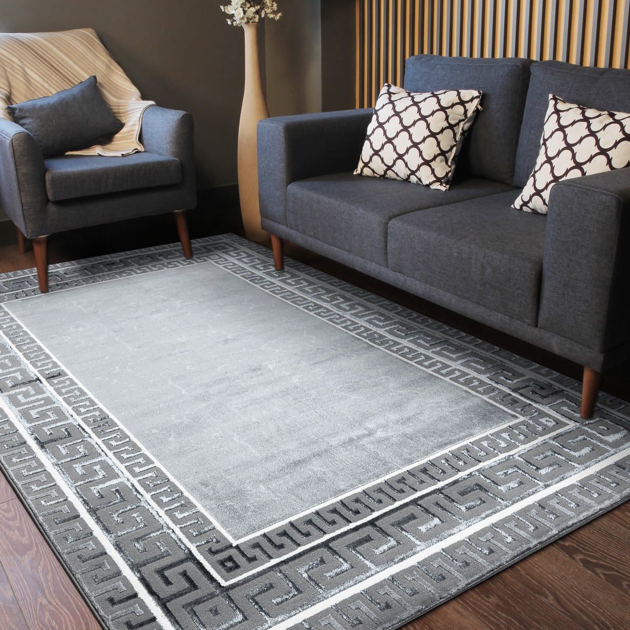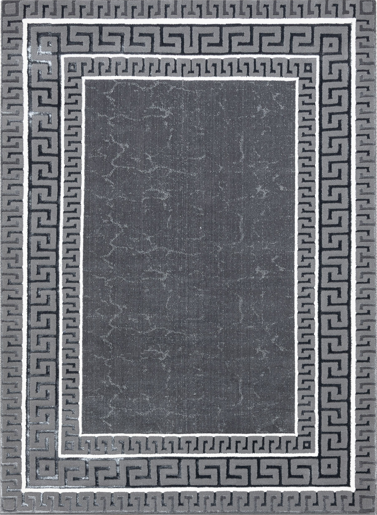 Kusový koberec Allure 1960 grey je ukázkou moderní elegance v tmavém provedení. Grafitově šedý podklad doplňuje výrazná bordura s motivem řeckého klíče v kontrastní černo-bílé kombinaci. Tento design působí odvážně, noblesně a dokáže dodat interiéru sofistikovanou atmosféru s nádechem luxusu. Koberec je vyrobený ze směsi 60 % polypropylenu a 40 % polyesteru, což zajišťuje jeho odolnost i příjemnou hebkost. Dvě výšky vlasu vytvářejí jemný 3D efekt, který podtrhuje strukturu bordury i detailní vzor. Certifikace OEKO-TEX garantuje zdravotní nezávadnost. Výška vlasu: 10 mm.
