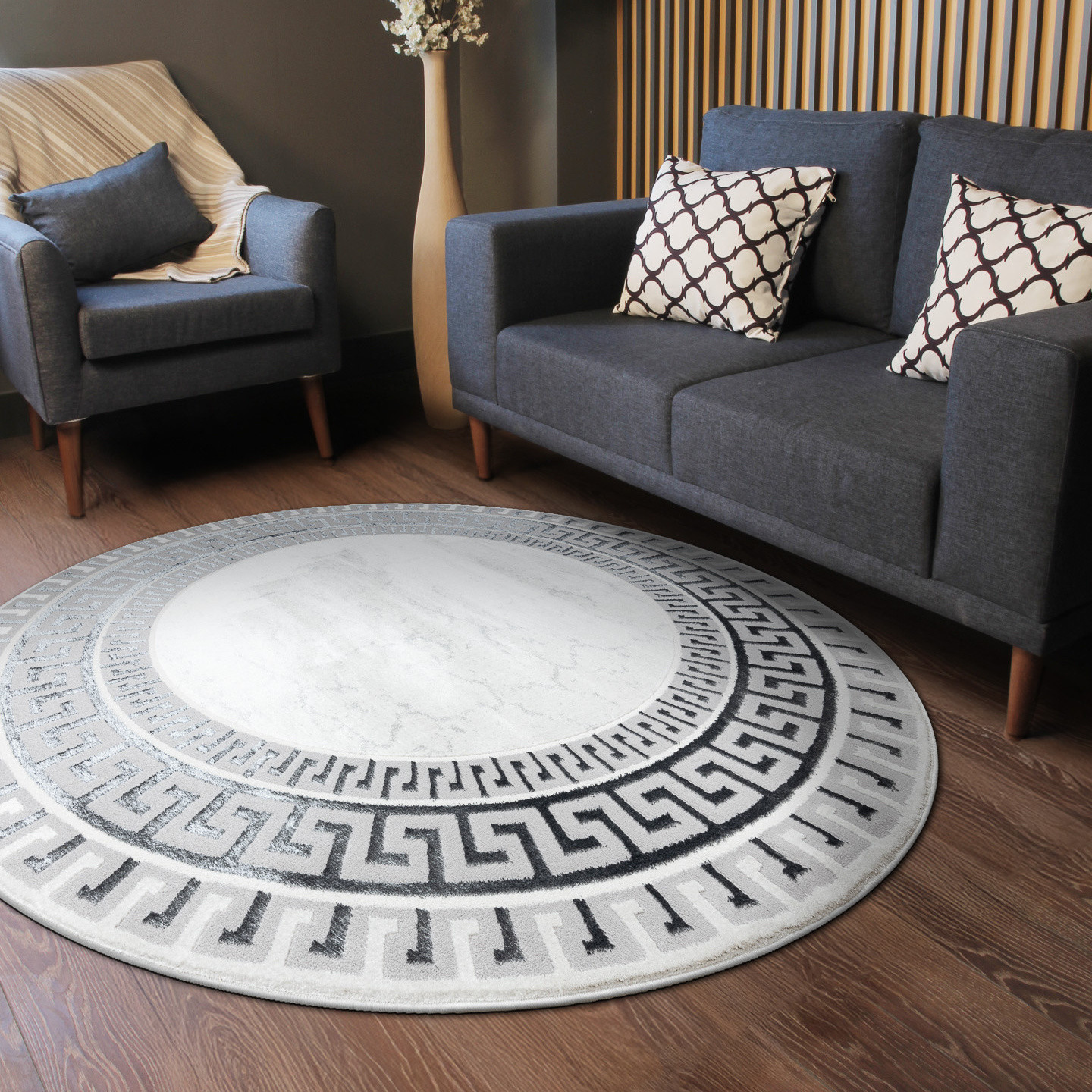 Kruhový koberec Allure 1960 white/grey se skvěle hodí do obývacího pokoje jako reprezentativní prvek, do ložnice pro vytvoření harmonického prostředí i do pracovny, kde podpoří elegantní a seriózní atmosféru. Působí moderně a zároveň nadčasově díky elegantnímu spojení geometrie a jemného mramorového efektu. Světlý podklad s decentní kresbou kontrastuje s výraznou bordurou v šedo-černém provedení, která připomíná klasický motiv řeckého klíče. Koberec je vyrobený ze směsi 60 % polypropylenu a 40 % polyesteru, takže je pevný, odolný a zároveň měkký na dotek. Dvě úrovně vlasu vytvářejí jemný 3D efekt, který podtrhuje strukturu a dodává koberci vizuální hloubku. Certifikace OEKO-TEX garantuje zdravotní nezávadnost, koberec je proto bezpečný i pro domácnosti s dětmi či alergiky. Samozřejmostí je i možnost použití s podlahovým vytápěním. Výška vlasu: 10 mm.