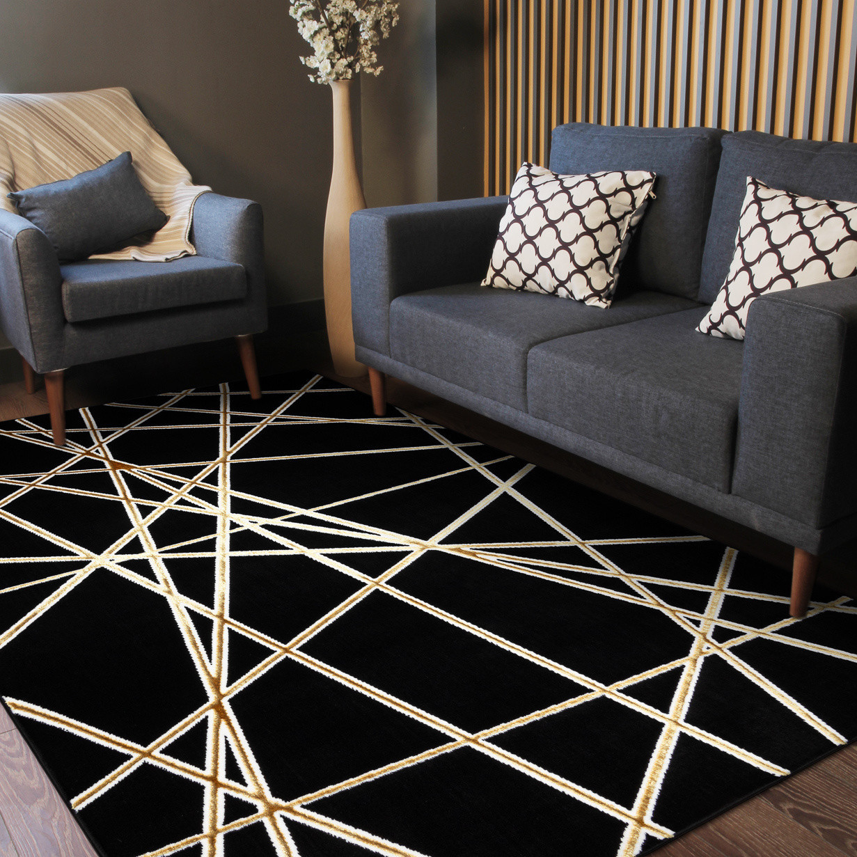 Koberec Allure 1964 black/gold je ukázkou moderního designu v té nejstylovější podobě. Černý podklad zdobí zlaté linie, které se kříží v dynamickém geometrickém vzoru připomínajícím světelnou síť. Výsledkem je odvážný a působivý design, který interiéru dodá energii, šmrnc a nádech luxusu. Koberec je vyrobený z polypropylenu a polyesteru, což mu zajišťuje vysokou odolnost i příjemně měkký povrch. Dvě výšky vlasu vytvářejí jemný 3D efekt, který zvýrazňuje geometrické linie a dodává koberci hloubku. Certifikace OEKO-TEX zaručuje zdravotní nezávadnost. Allure se perfektně hodí do moderních obývacích pokojů a pracoven, kde se stane nepřehlédnutelným středobodem, nebo do ložnic, kde vnese elegantní kontrast a atmosféru současného luxusu. Výška vlasu: 10 mm.