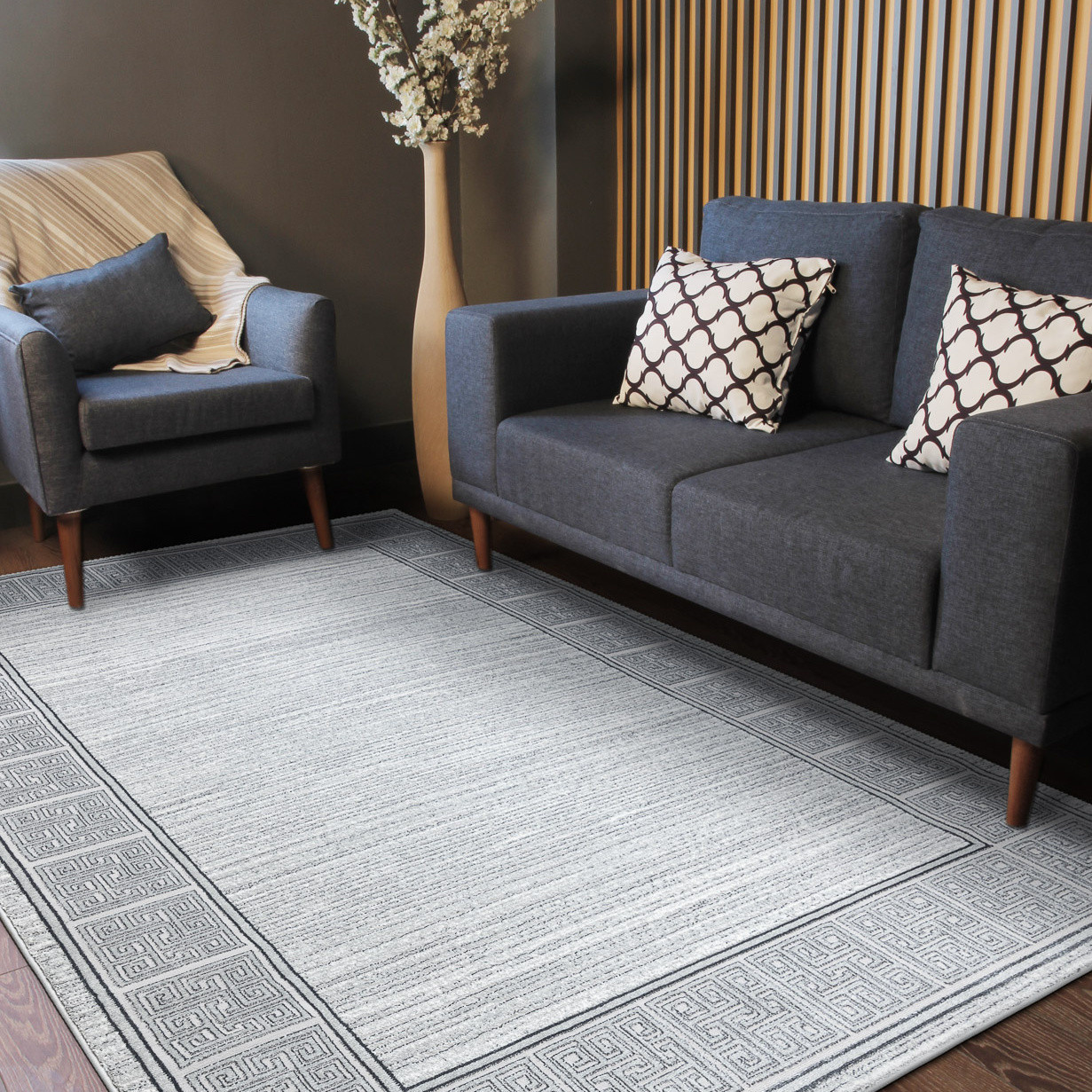 Kusový koberec Allure 8783 l.grey/white zaujme svou jednoduchou elegancí a čistým geometrickým designem. Bílý podklad doplňuje výrazná bordura s řeckým klíčem, která působí sofistikovaně a dodává koberci nadčasový vzhled. Minimalistické provedení dělá z tohoto koberce univerzální doplněk, který snadno sladíte s moderním i klasickým interiérem. Koberec je vyrobený ze směsi 60 % polypropylenu a 40 % polyesteru, takže je odolný a zároveň příjemně měkký na dotek. Dvě výšky vlasu vytvářejí jemný 3D efekt, který podtrhuje borduru i strukturovaný povrch a dodává koberci hloubku. Allure 8783 je ideální volbou do obývacího pokoje, kde se stane decentním a elegantním základem, do ložnice pro pocit klidu a harmonie, nebo do pracovny, kde podpoří seriózní atmosféru. Výška vlasu: 10 mm.