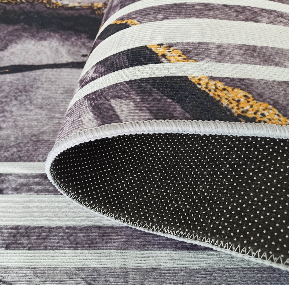 Tmavě šedý moderní koberec s velmi módním vzorem inspirovaným kresbou kamene. Sytě šedé a zlaté akcenty mu dodávají jedinečný, elegantní charakter. Koberec HONOR Rock skvěle doplní každý interiér, ať už klasický, nebo moderní. Je stvořen i pro stylový obývací pokoj, ale najde si cestu i do krásné ložnice nebo reprezentativní jídelny. Zlatě zvýrazněné "polstrování" a geometrické linie jsou receptem na útulný, harmonický a poutavý interiér. Koberec má protiskluzový podklad, takže neklouže po podlaze a můžete ho snadno položit na panely, desky nebo keramickou dlažbu. Je vyroben z kvalitního polyesteru - je trvanlivý, odolný vůči mechanickému poškození a lze jej prát na 30 stupňů. Svůj krásný vzhled si zachová po velmi dlouhou dobu. Nebude měnit barvu ani se deformovat.