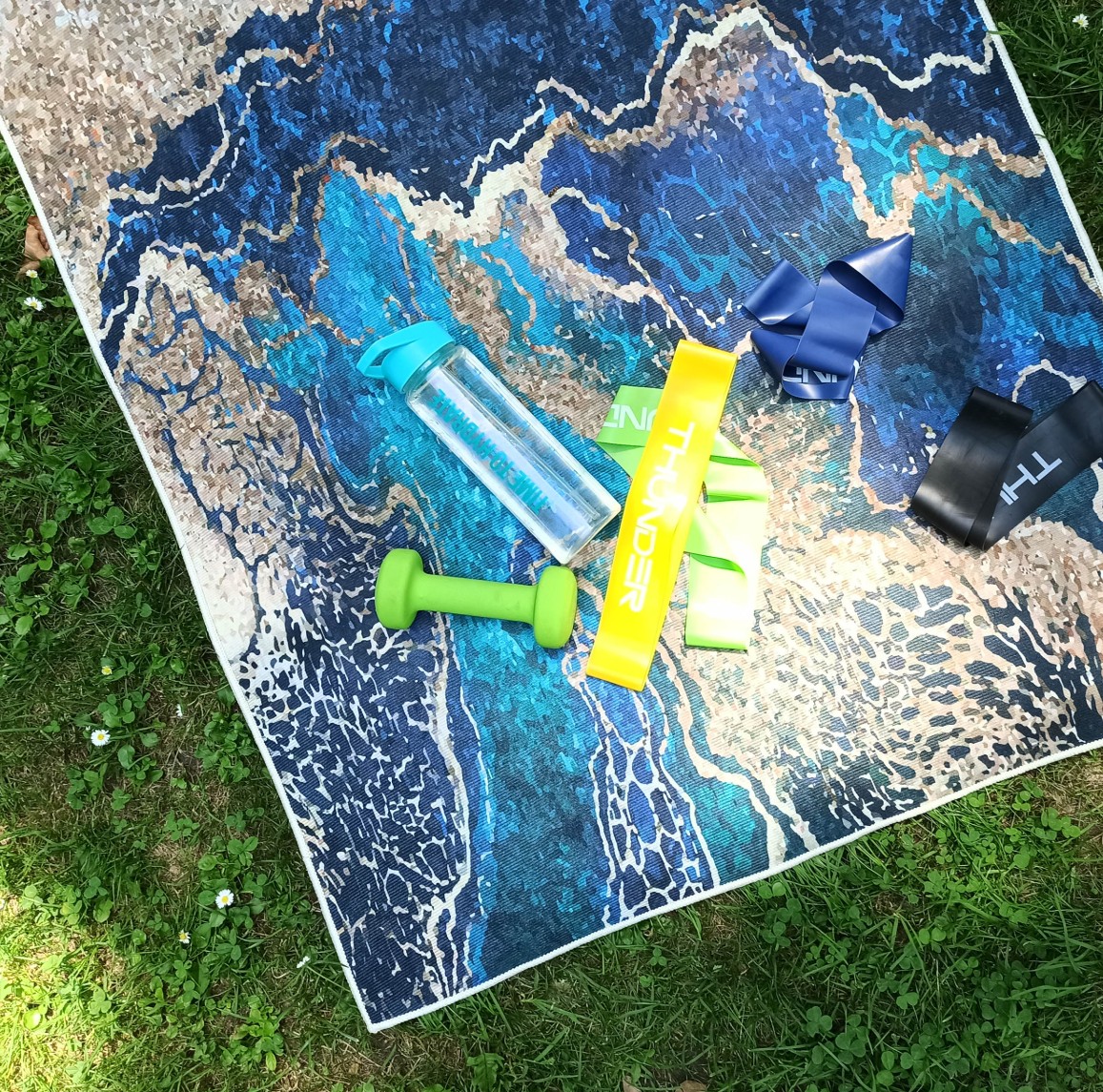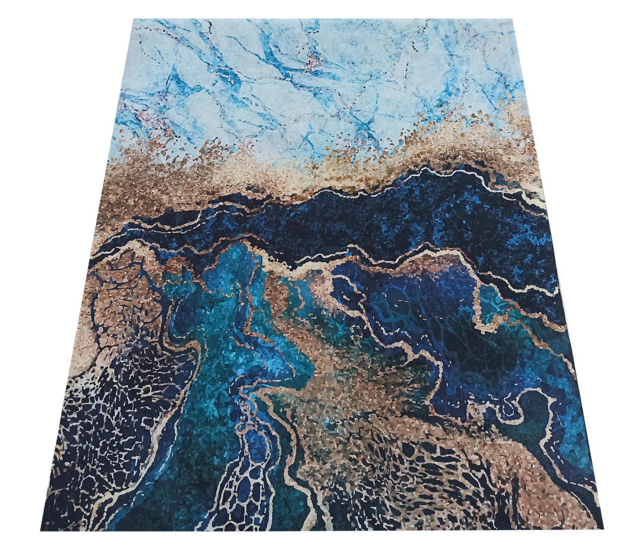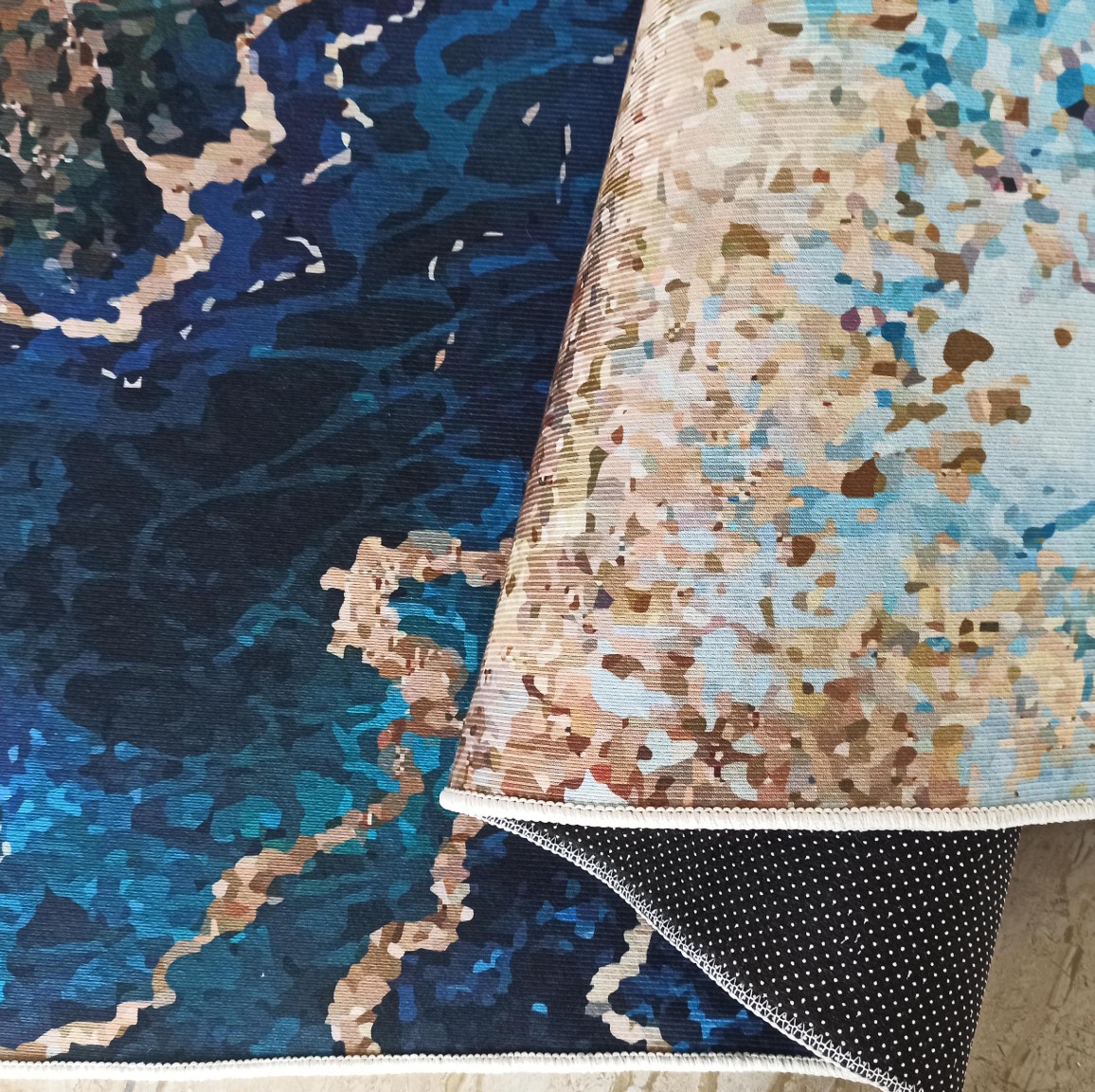 Velmi nápadný modrozlatý koberec s módním motivem připomínajícím mořské pobřeží vnese nádech originality do každého stylového obývacího pokoje, ložnice, jídelny nebo kuchyně. Koberec upoutá pozornost a ozdobí jakýkoli styl interiéru, od moderního po klasický. Nejlepším nápadem je kombinovat tento koberec s tlumenou barevnou paletou, například s béžovou, šedou, bílou a černou. Skvěle se také hodí k tmavě modré nebo modré pohovce a ke zlatým doplňkům. Koberec je protiskluzový, vyrobený z odolného polyesteru, díky čemuž je odolný a pevný. Velkou předností je možnost praní v pračce.